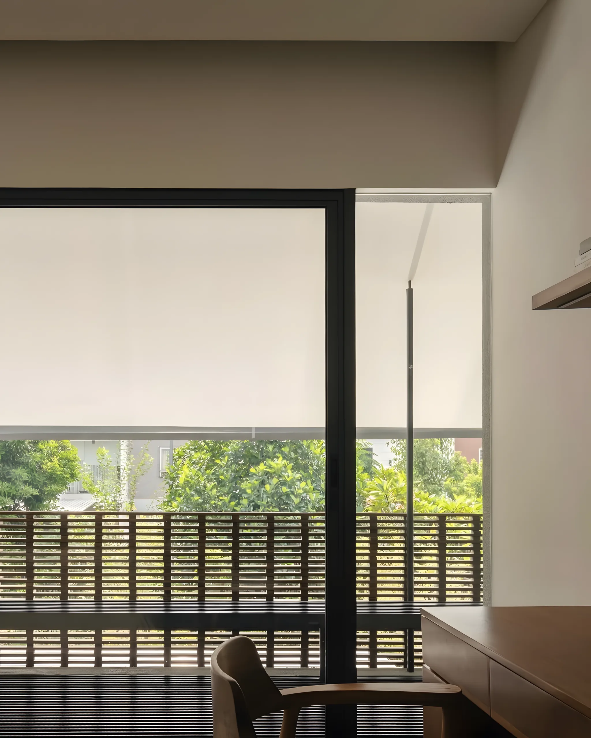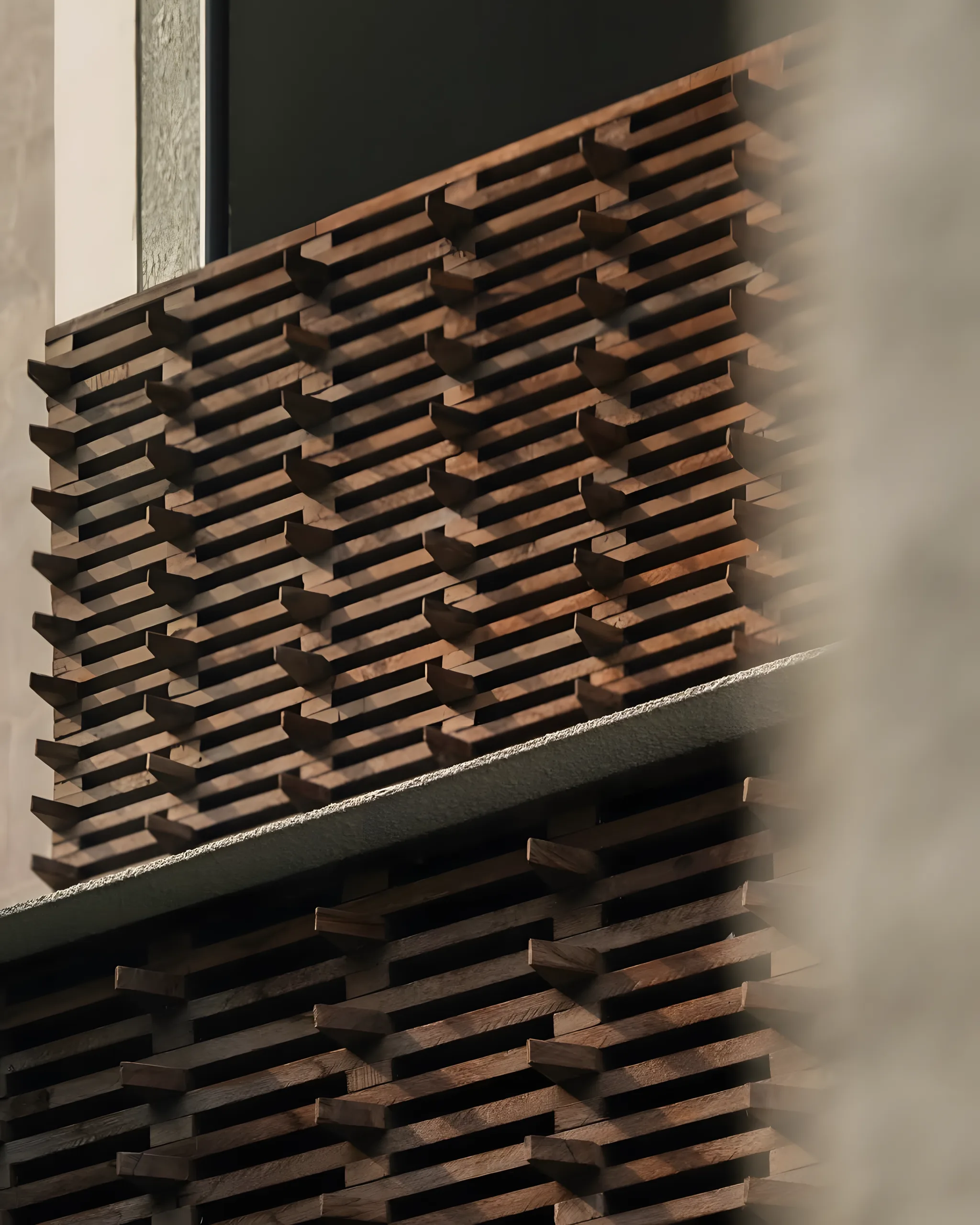 Mặt đứng công trình sử dụng sự phối hợp giữa bê tông mộc, kính và những mảng vật liệu mang màu sắc đất nung – đặc trưng của hình ảnh “ngói”, tạo nên nét nhận diện riêng cho dự án. Các lớp vật liệu đan xen theo chiều ngang – dọc tạo nên nhịp điệu kiến trúc sinh động, đồng thời tối ưu ánh sáng và thông gió tự nhiên cho không gian bên trong.