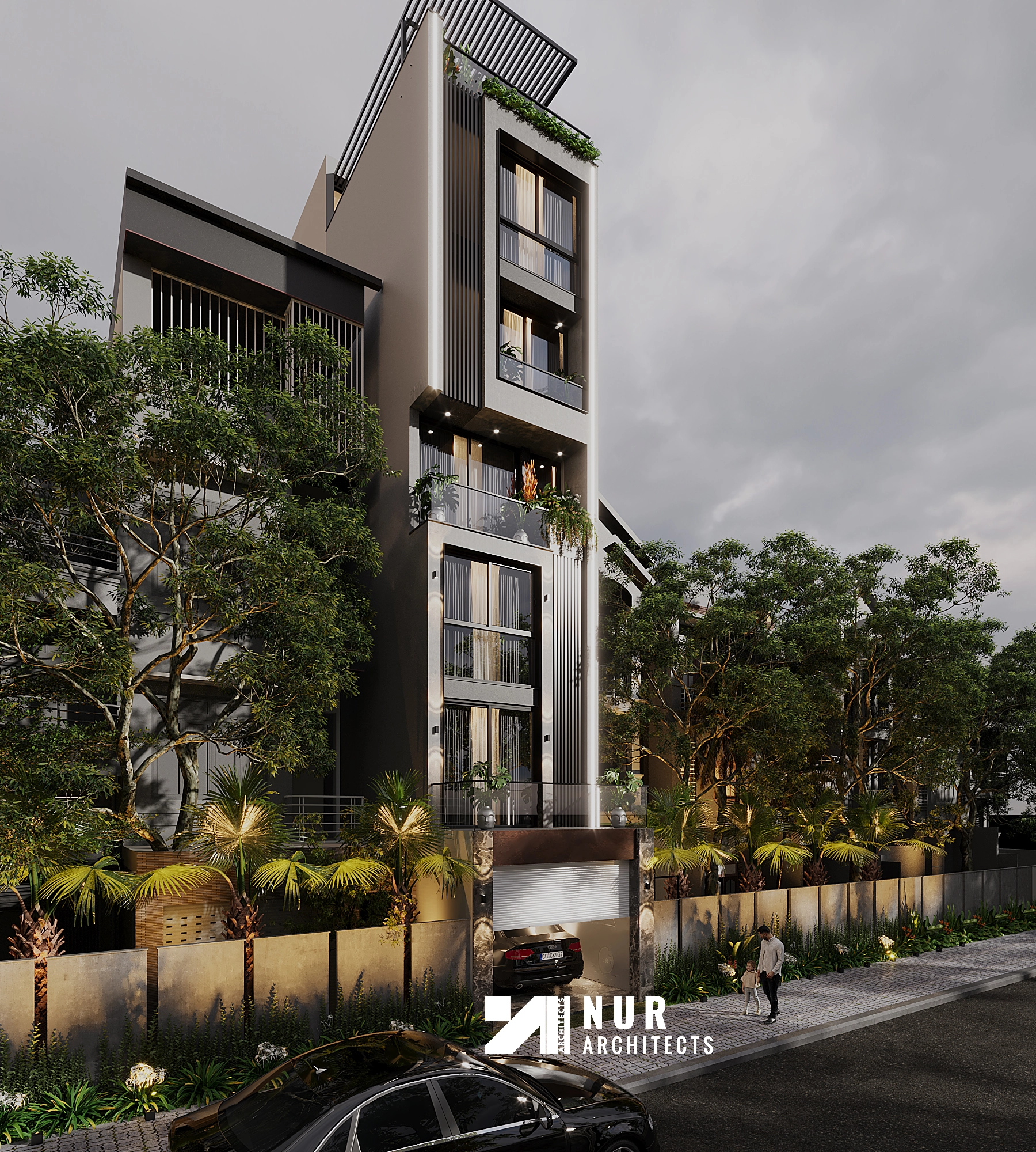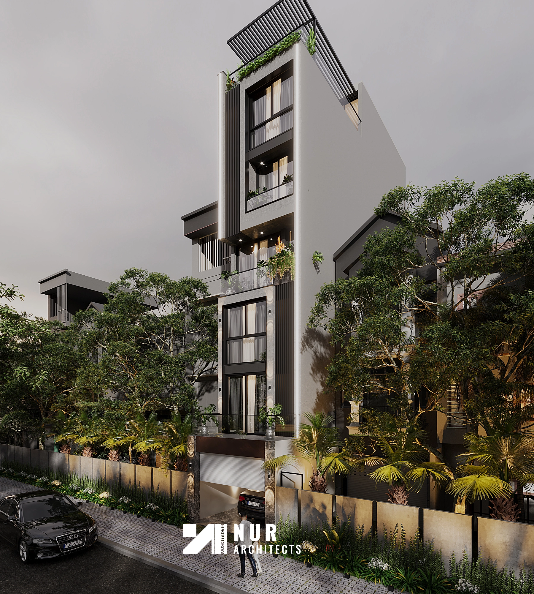 Căn nhà ống 5 tầng hiện đại nổi bật với hình khối cao vút, mặt tiền sơn xám trắng kết hợp lam nhôm đen dọc mạnh mẽ chạy suốt chiều cao, tạo hiệu ứng thị giác ấn tượng. Các tầng lùi dần xen kẽ ban công trồng cây xanh tầng tầng lớp lớp, mang hơi thở tropical vào không gian đô thị. Đỉnh nhà bố trí giàn lam che nắng kết hợp vườn treo, vừa giảm nhiệt vừa tạo điểm nhấn độc đáo. Hệ cửa kính khung nhôm đen ẩn, đèn LED hắt sáng tinh tế làm nổi bật texture bê tông và đá tự nhiên. Tổng thể sắc nét, sang trọng, gần gũi thiên nhiên dù nằm giữa phố thị đông đúc.